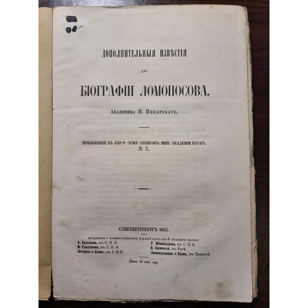 Рідкісне дореволюційне видання, присвячене біографії великого російського вченого Михайла Васильовича Ломоносова. Книга містить додаткові відомості про життя та діяльність Ломоносова, зібрані академіком П. Пекарським. Ця програма до VIII тому «Записок Імператорської Академії наук» (№7).
