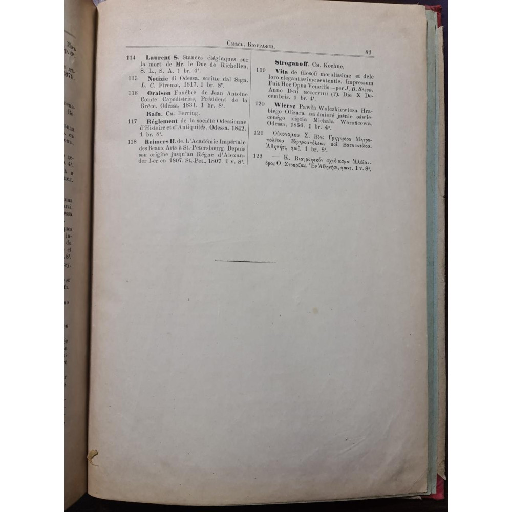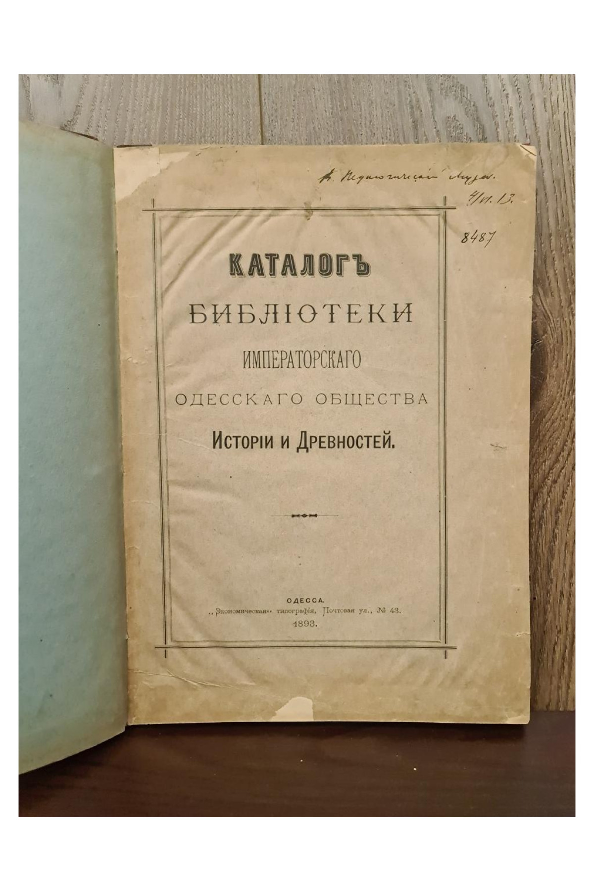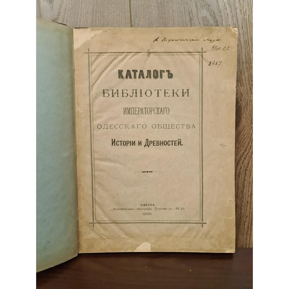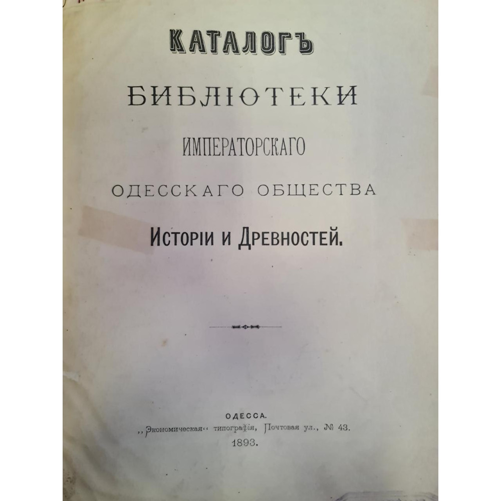 Рідкісне антикварне видання кінця XIX століття, що є офіційним каталогом бібліотеки Імператорського Одеського товариства історії та старожитностей. Видано 1893 року в Одесі.
