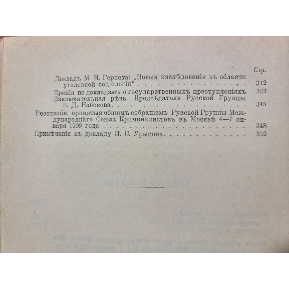 Унікальне видання початку XX століття, що є збіркою матеріалів засідання Російської групи Міжнародного союзу криміналістів, що відбулося в Москві 4-7 січня 1909 року. У книзі відображені ключові питання кримінального права, кримінології та криміналістики, які обговорювали провідні російські та зарубіжні правознавці того часу.