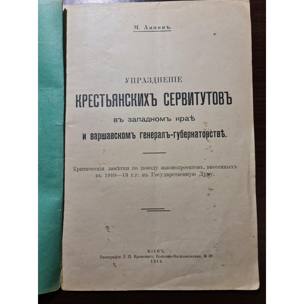 Рідкісна книга 1914 року: "Скасування селянських сервітутів у Західному краї та Варшавському генерал-губернаторстві" Автор: М. Анинъ