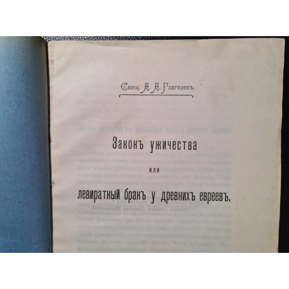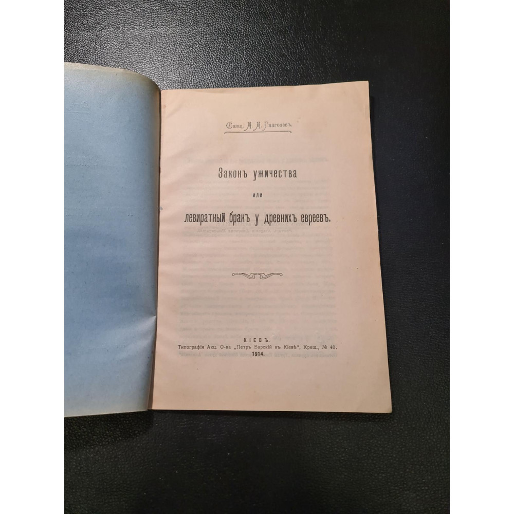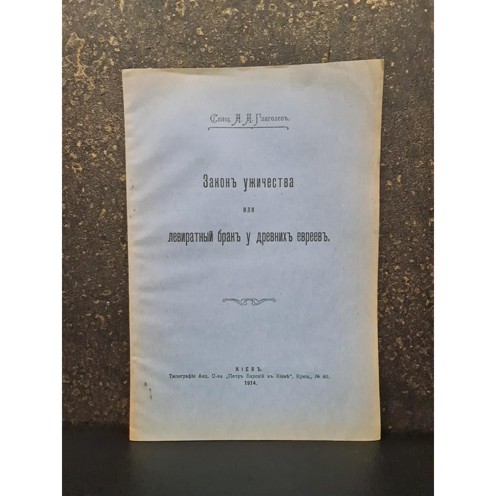 Закон ужичества або левіратний шлюб у стародавніх євреїв", написана священиком А. А. Глаголєвим. Вона була видана в Києві в 1914 році в друкарні Акціонерного товариства "Петро Барський у Києві".