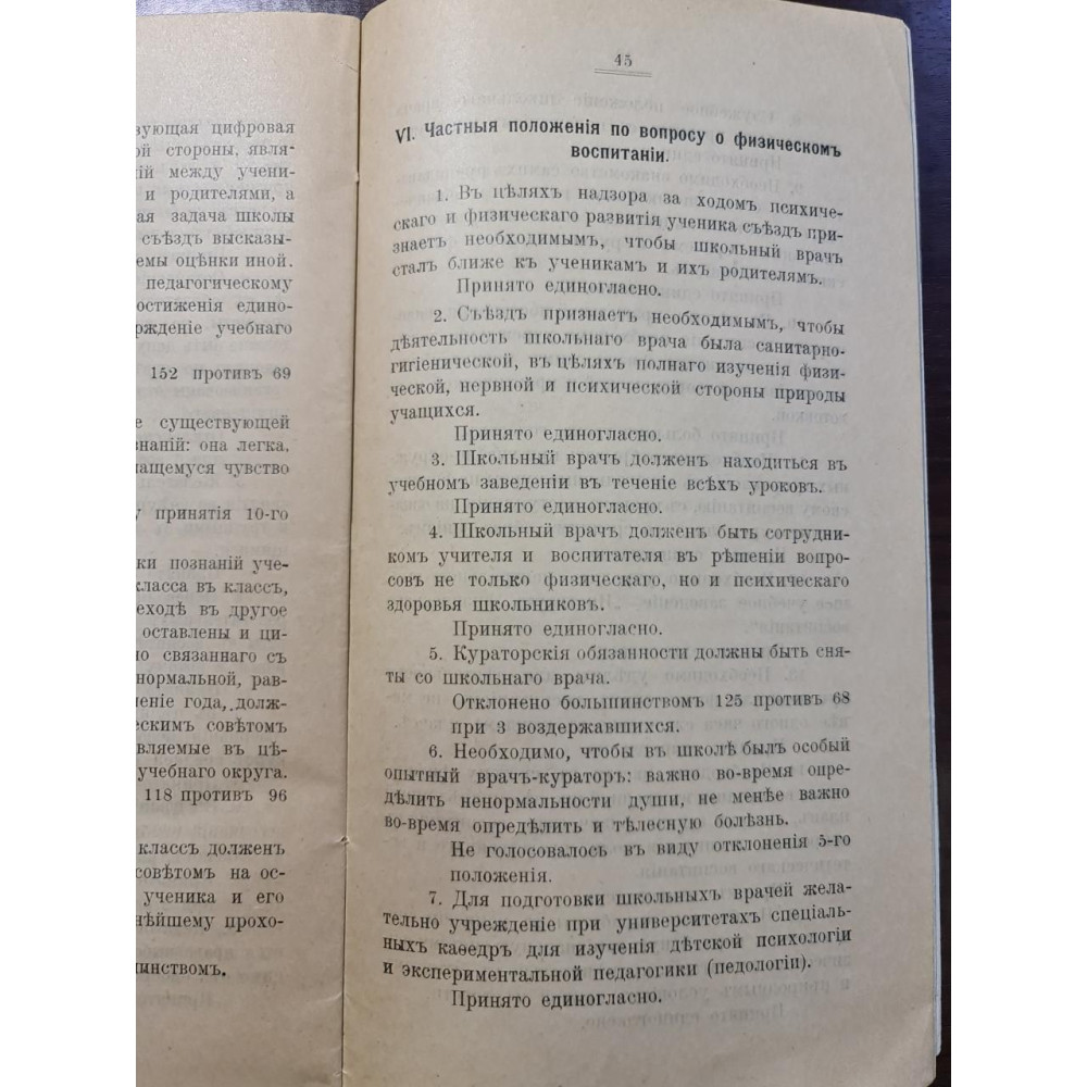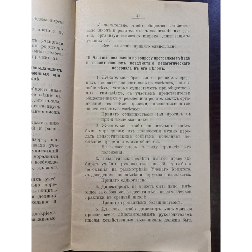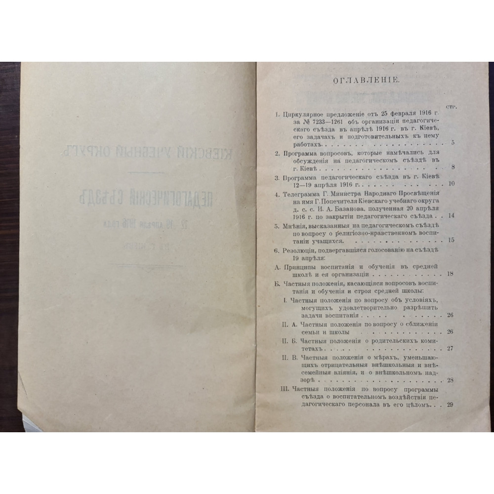 Рідкісне історичне видання, що є збіркою матеріалів і доповідей, представлених на Педагогічному з'їзді, що відбувся в Києві в 1916 році. У книзі розглядаються ключові питання освіти, методики викладання, реформ у шкільній системі, а також вплив соціальних та політичних факторів на систему навчання на початку XX століття.