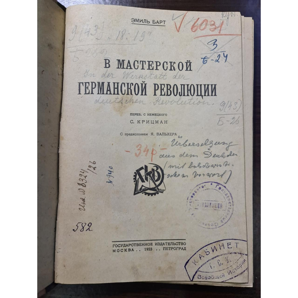 Книга «У майстерні німецької революції» є безцінним свідченням епохи, написане Емілем Бартом, одним з активних учасників революційних подій у Німеччині на початку XX століття. Автор докладно описує причини, хід та наслідки революції 1918 року, а також аналізує політичні процеси, що вплинули на розвиток робітничого руху та долю Веймарської республіки.